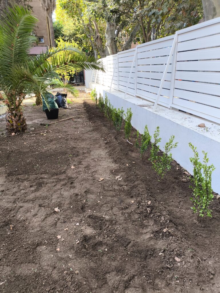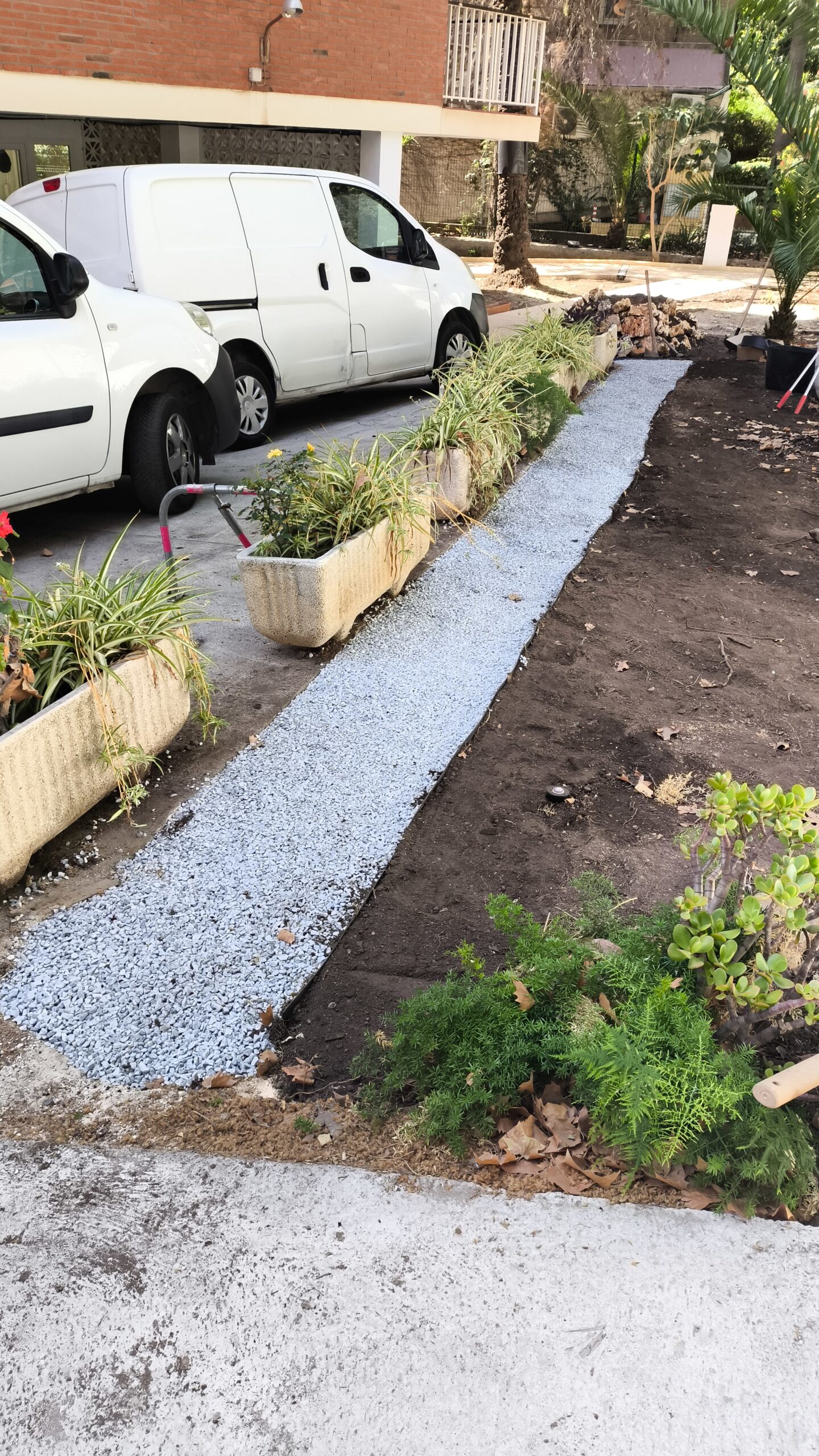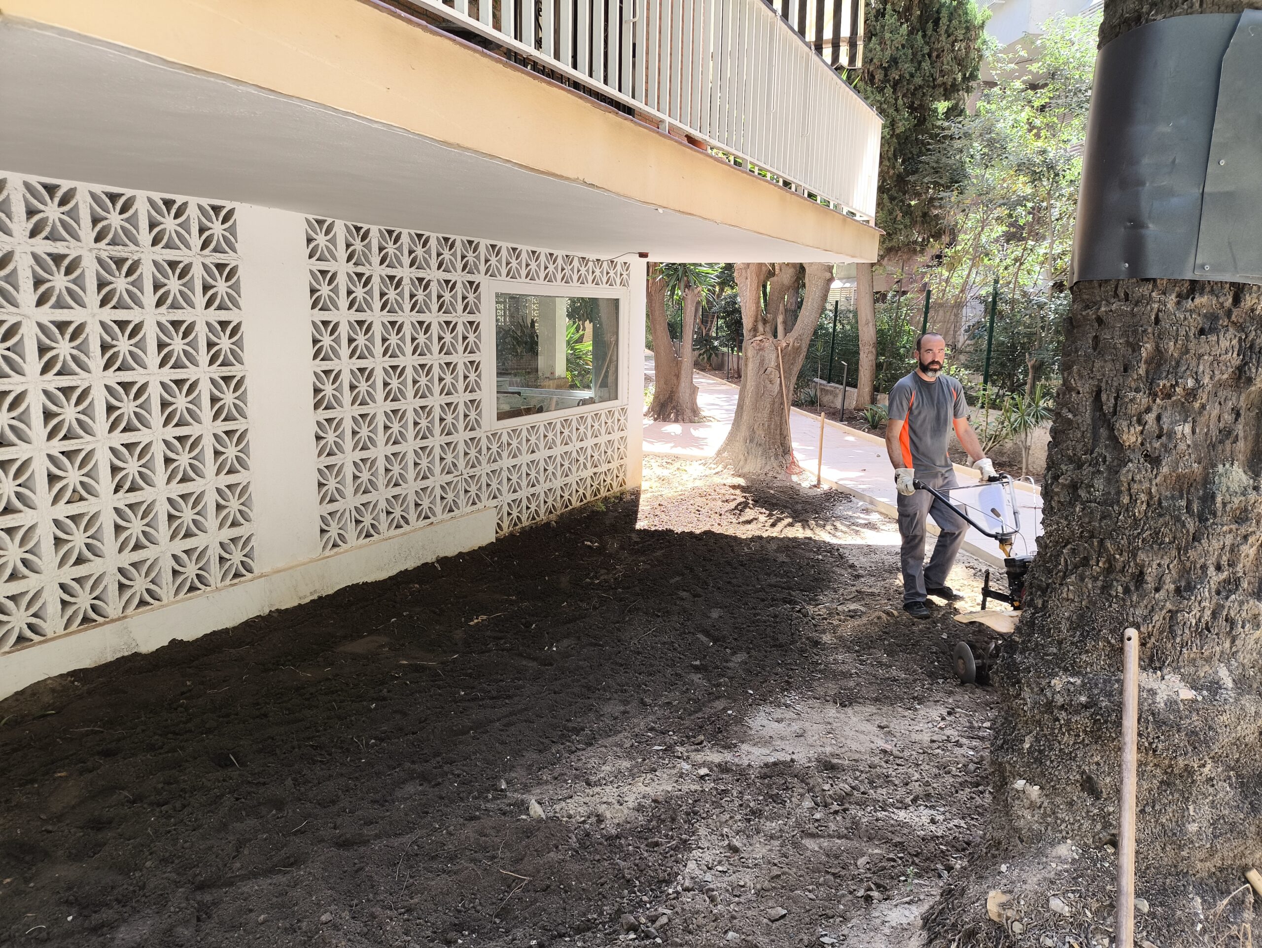 Retiramos los escombros y labramos las zonas más extensas con motoazada, añadiendo tierra vegetal ya que la obra había dejado un desnivel entre el camino de cemento y la tierra.