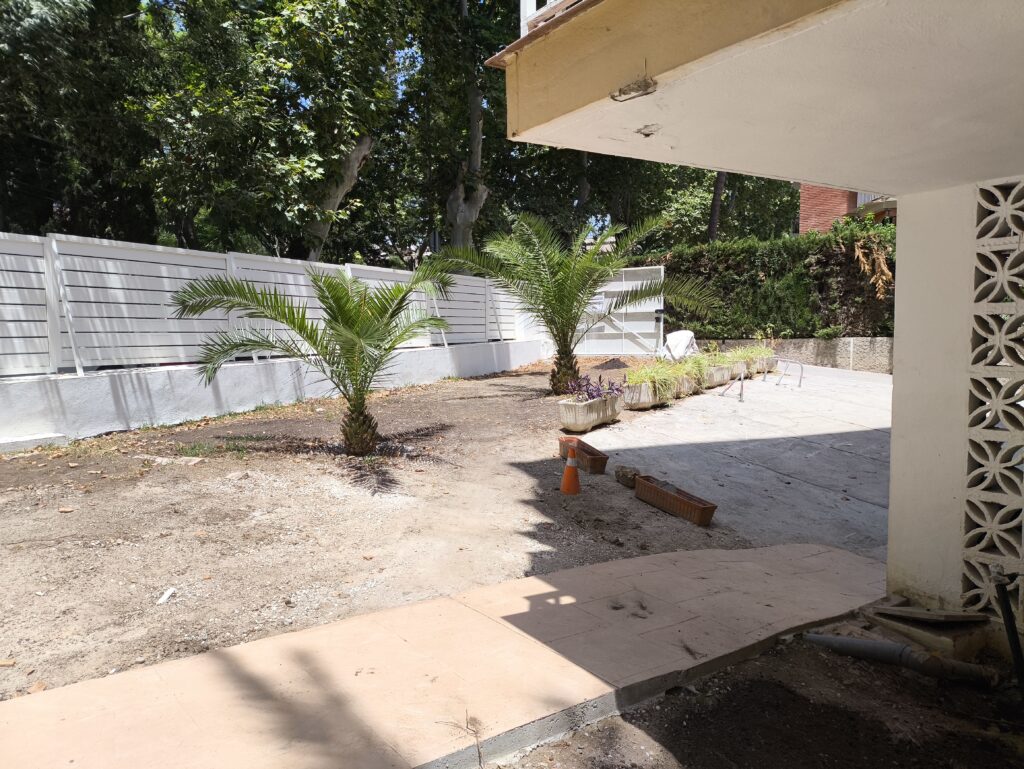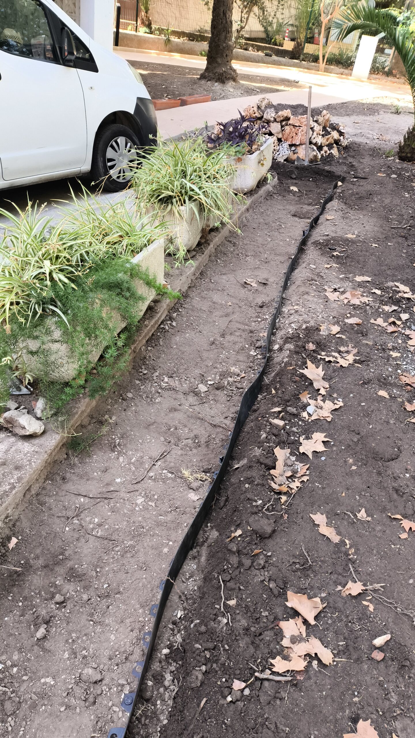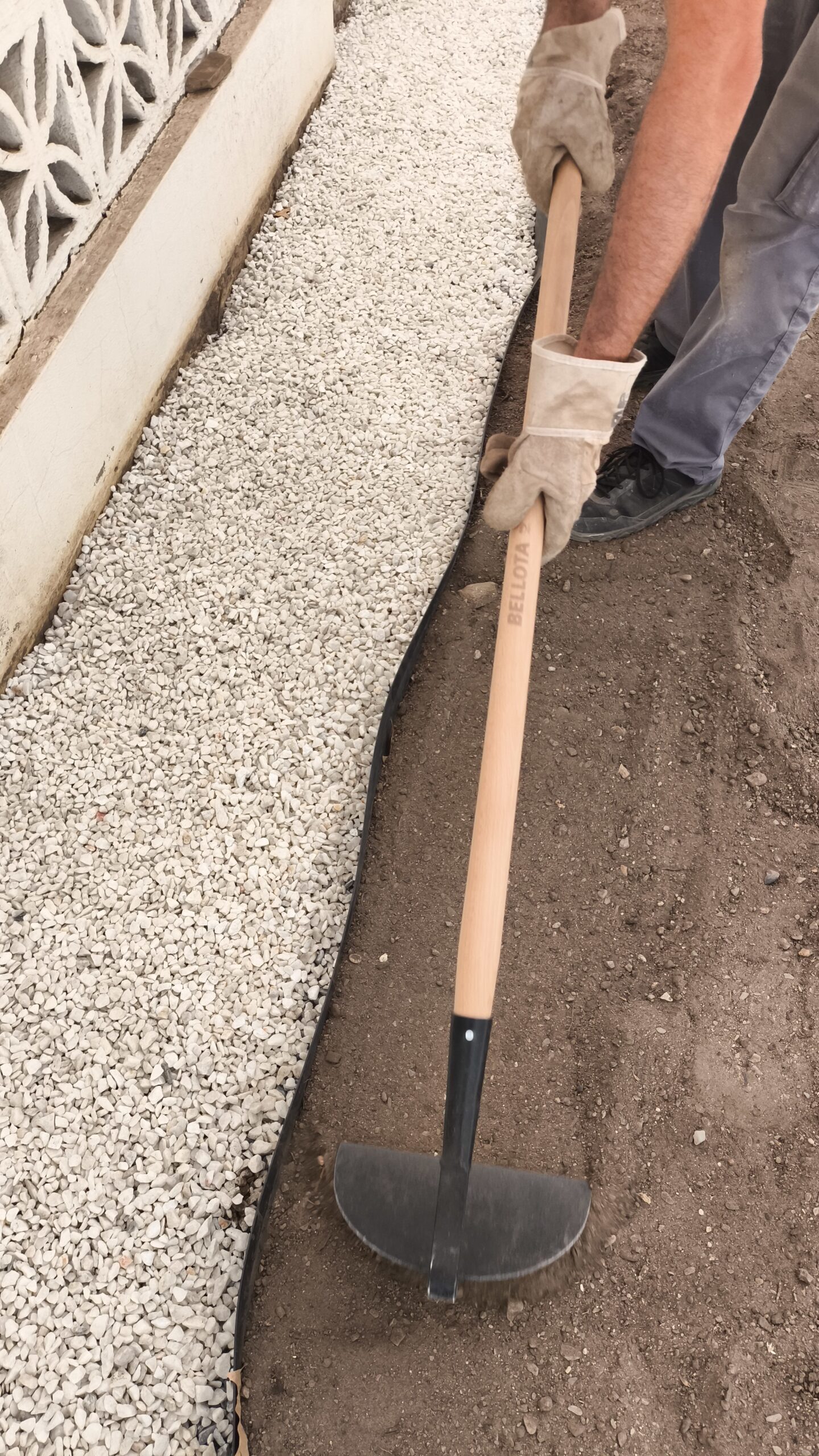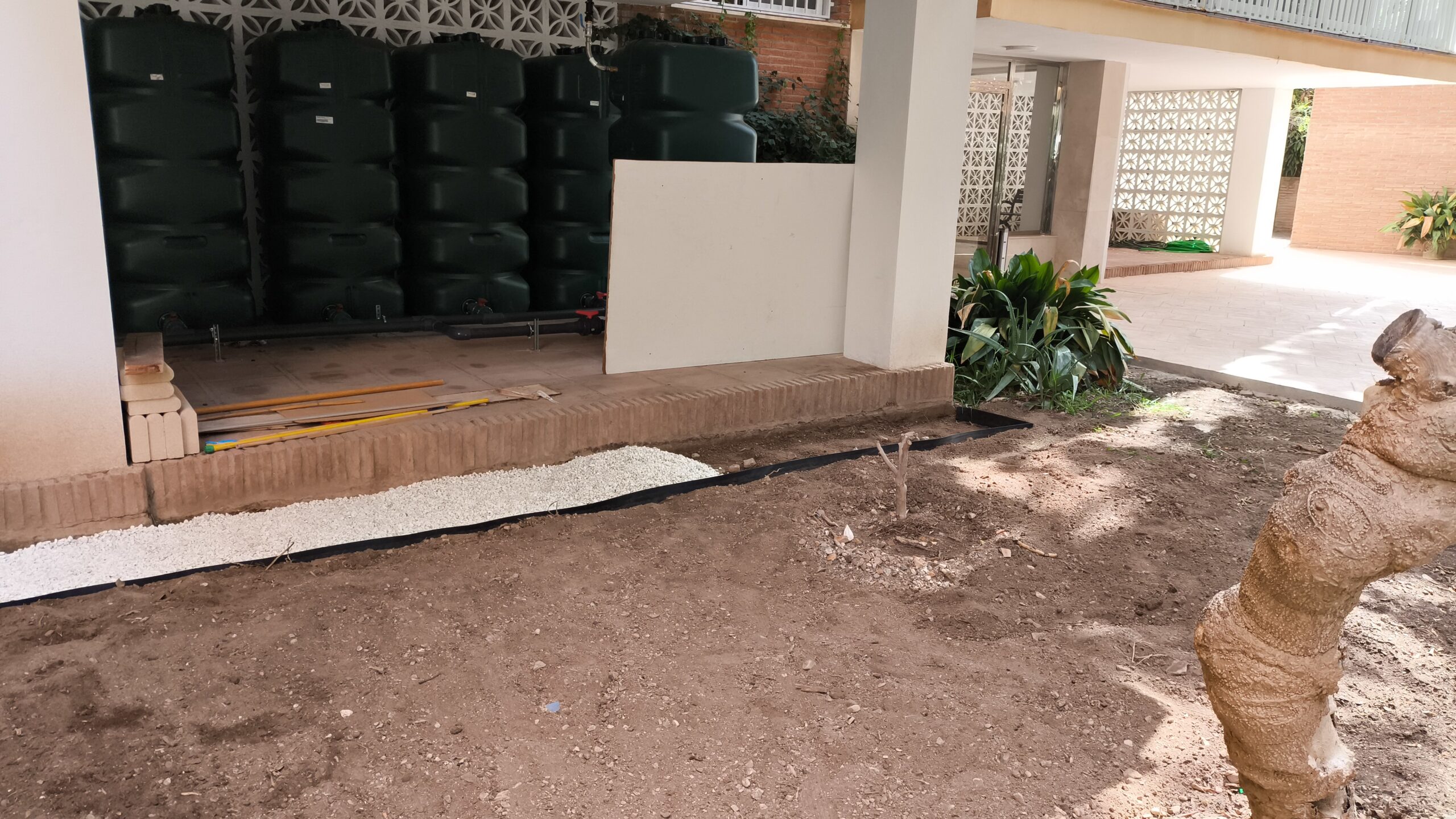 Retiramos los escombros y labramos las zonas más extensas con motoazada, añadiendo tierra vegetal ya que la obra había dejado un desnivel entre el camino de cemento y la tierra.