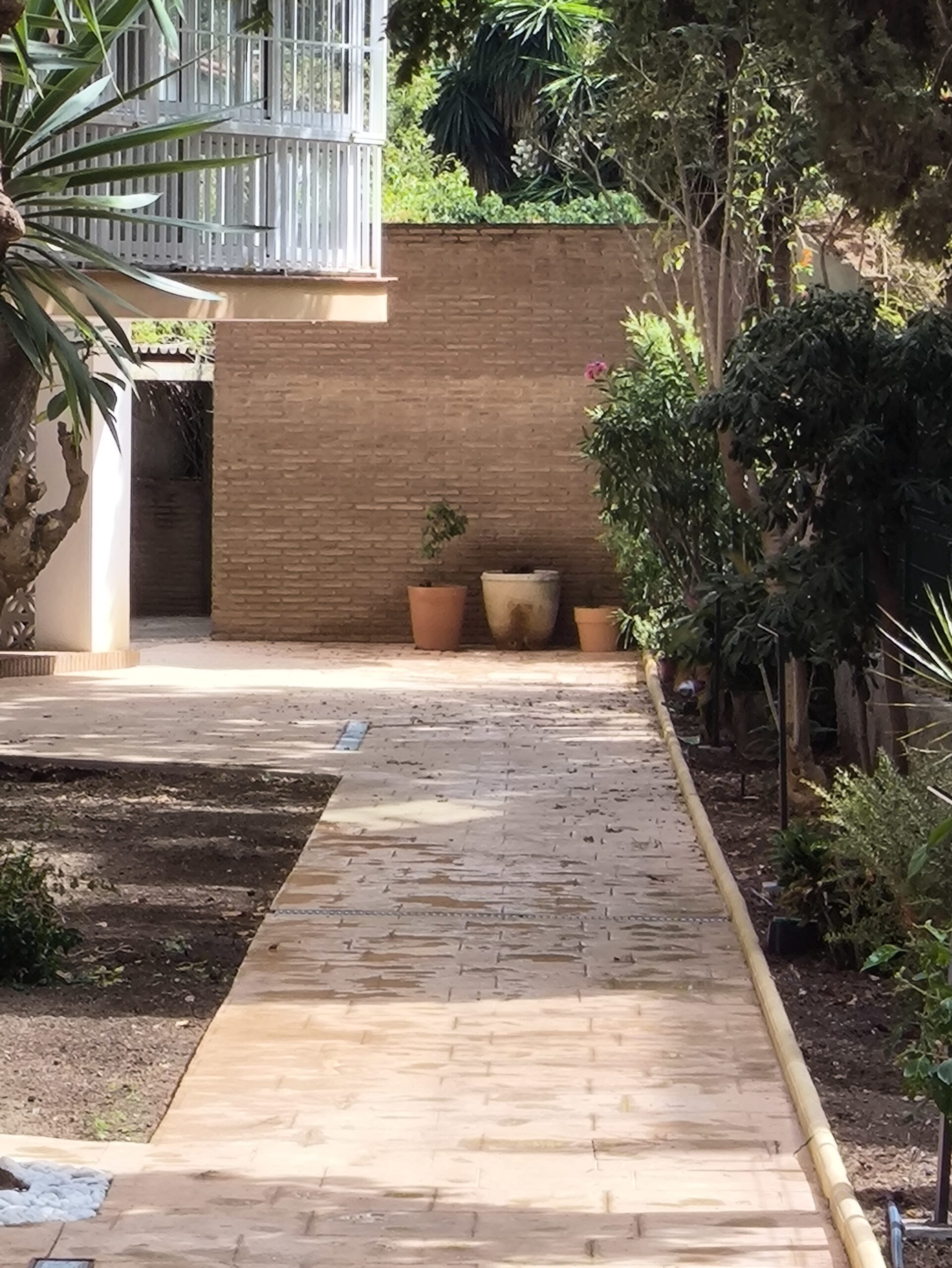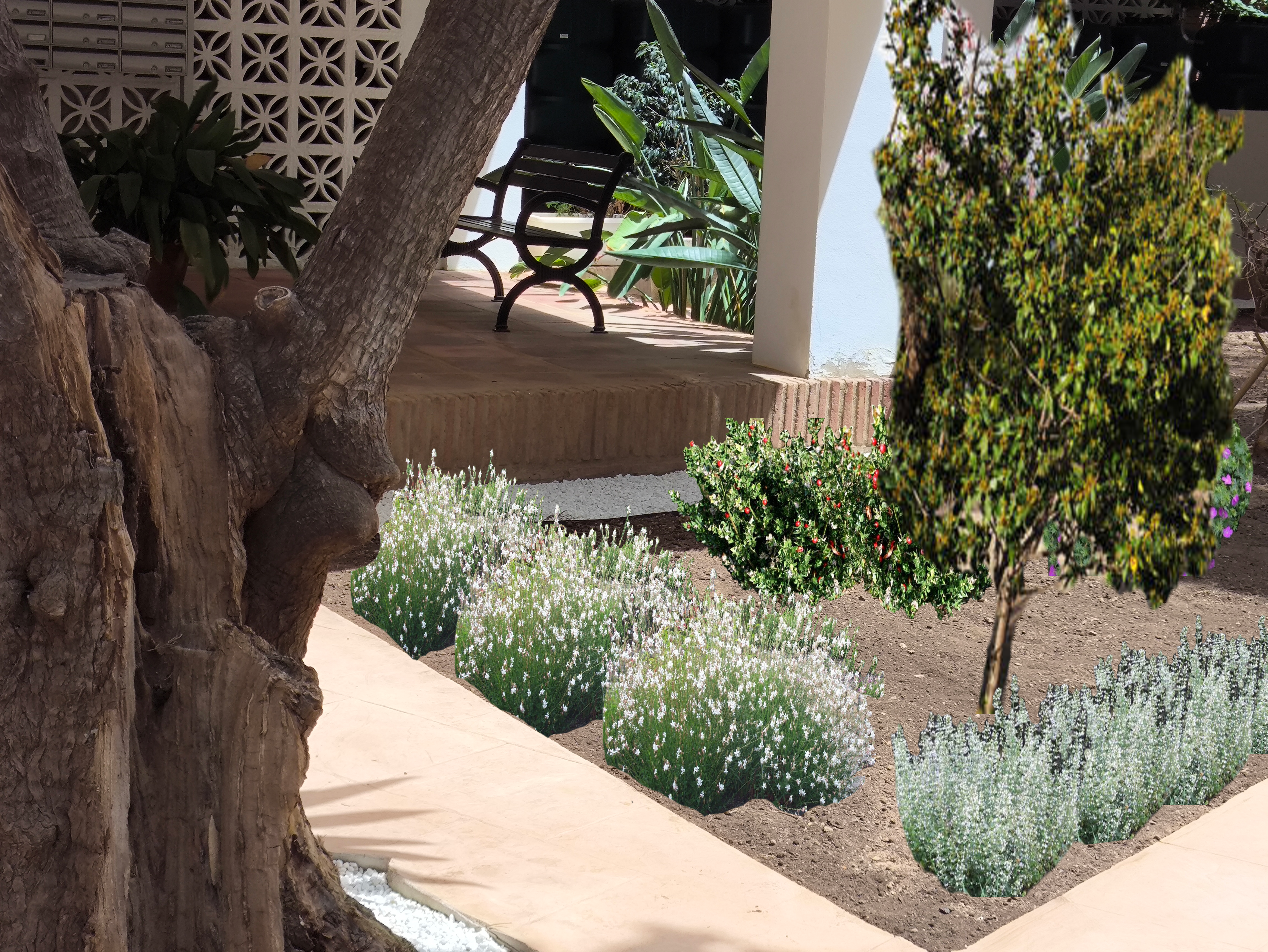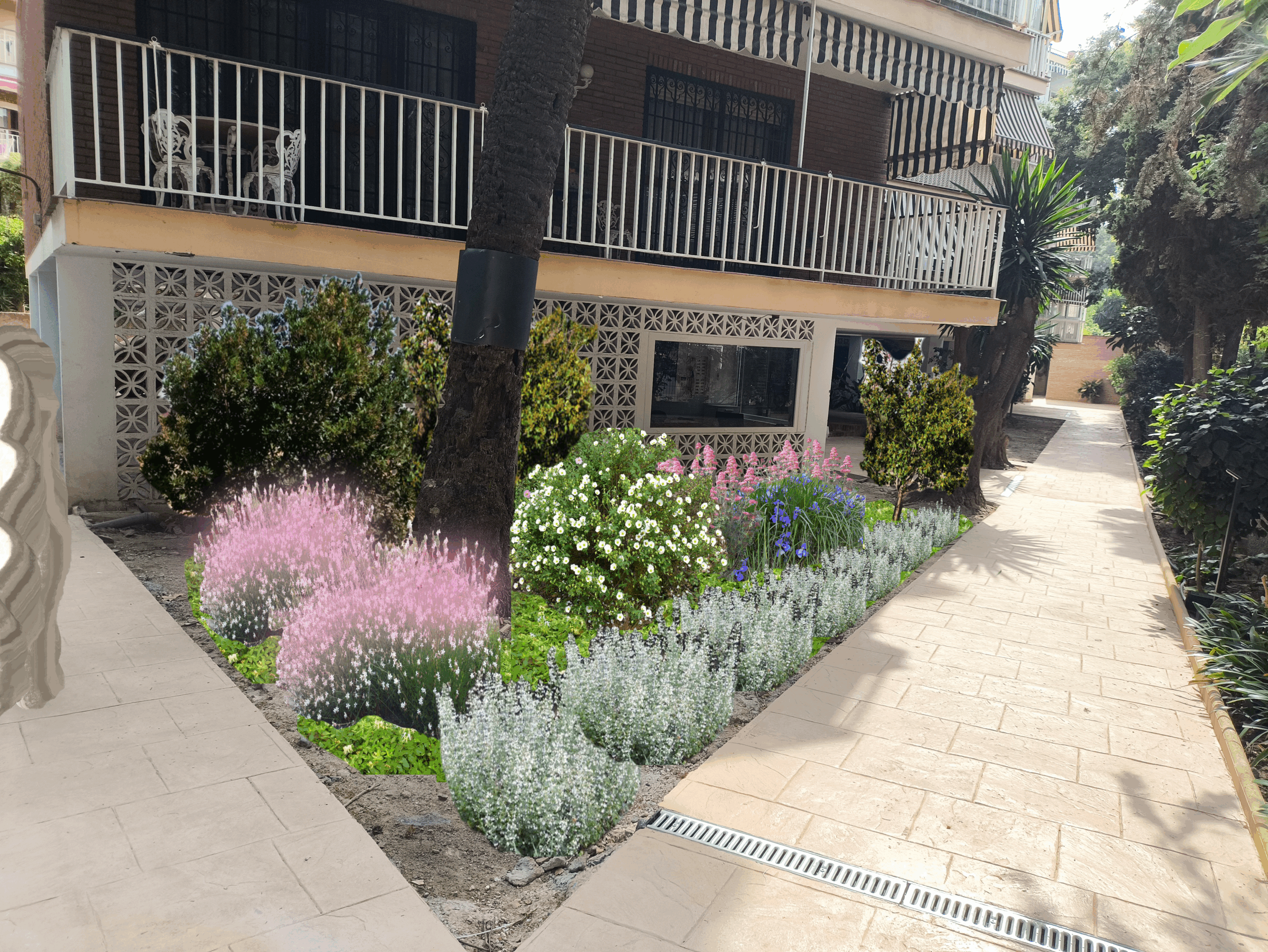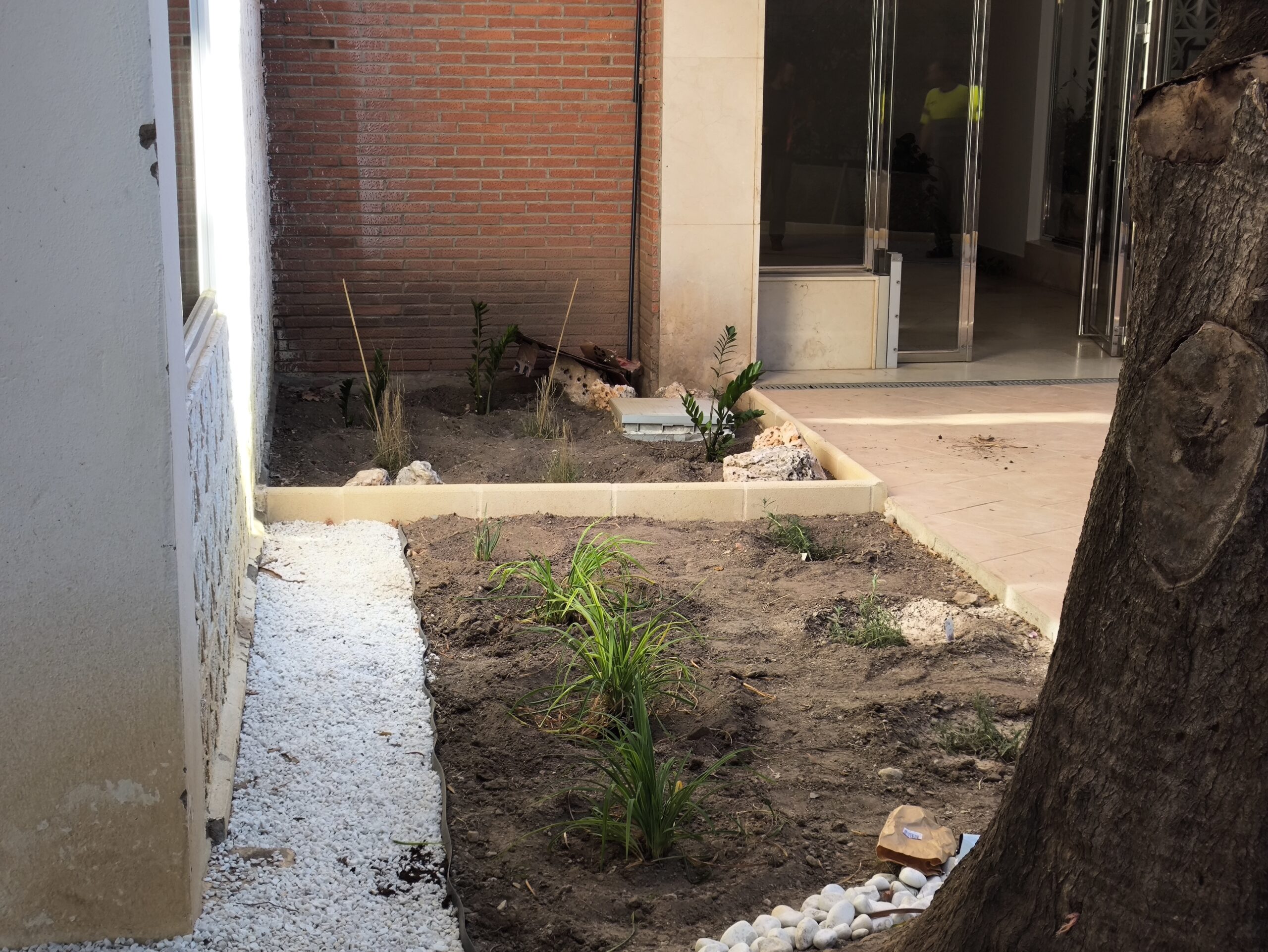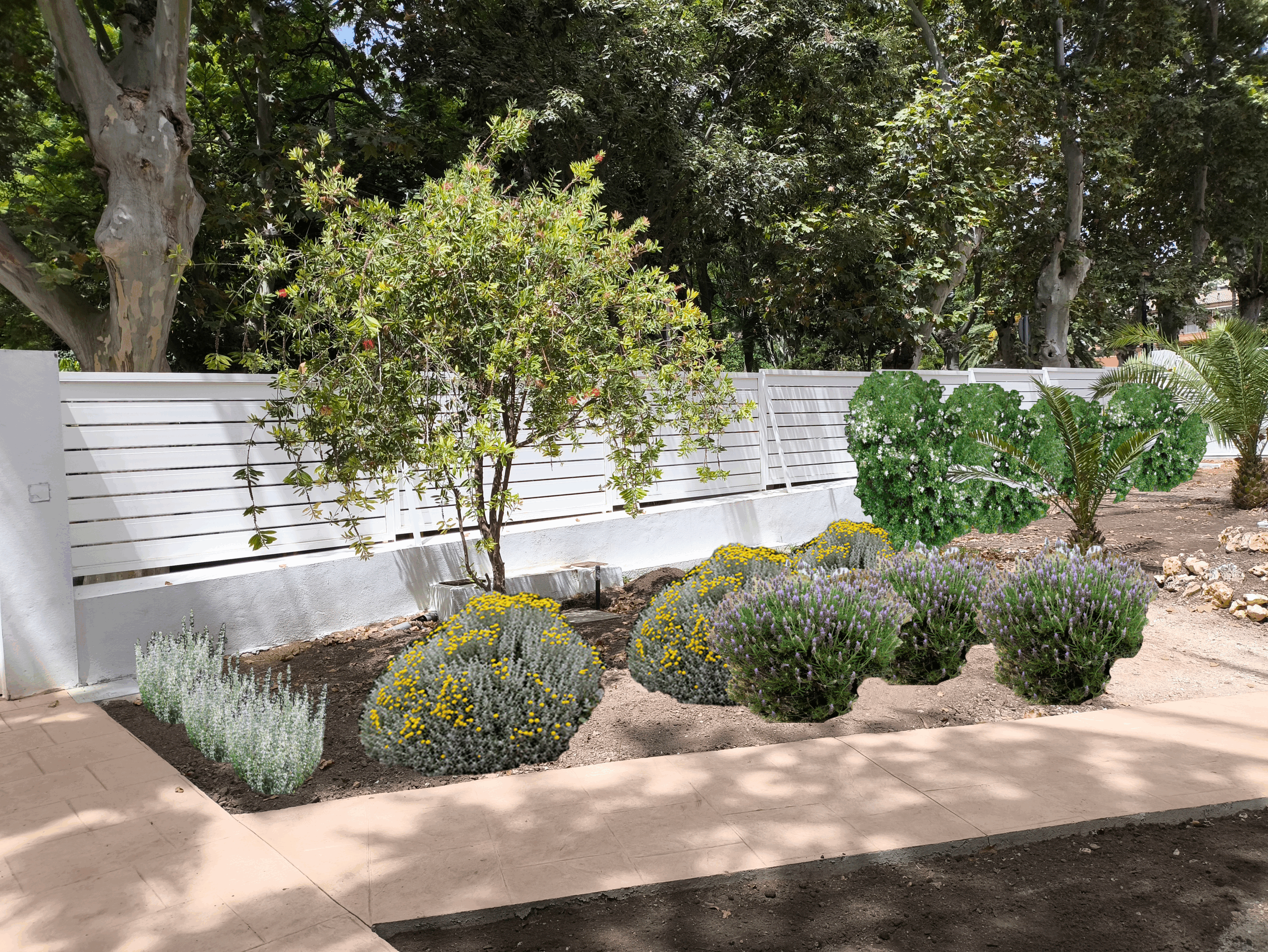 En esta urbanización del Limonar, unas obras en el recinto habían destrozado el jardín. Los propietarios vieron la oportunidad de mejorar su resiliencia, ya que las restricciones de riego del año anterior habían afectado severamente. Les propusimos crear tres zonas diferenciadas. En la cochera, sustituir el césped de grama por una cobertura de Lippia, con riego por difusores. En el arriate que linda con la propiedad vecina, un riego por goteo, manteniendo la estructura básica de lo que quedaba del jardín y rellenando con suculentas para aumentar la cobertura de suelo. En el resto del jardín, un diseño de jardín ecológico sin riego, adaptado a las condiciones de muy baja insolación del terreno.