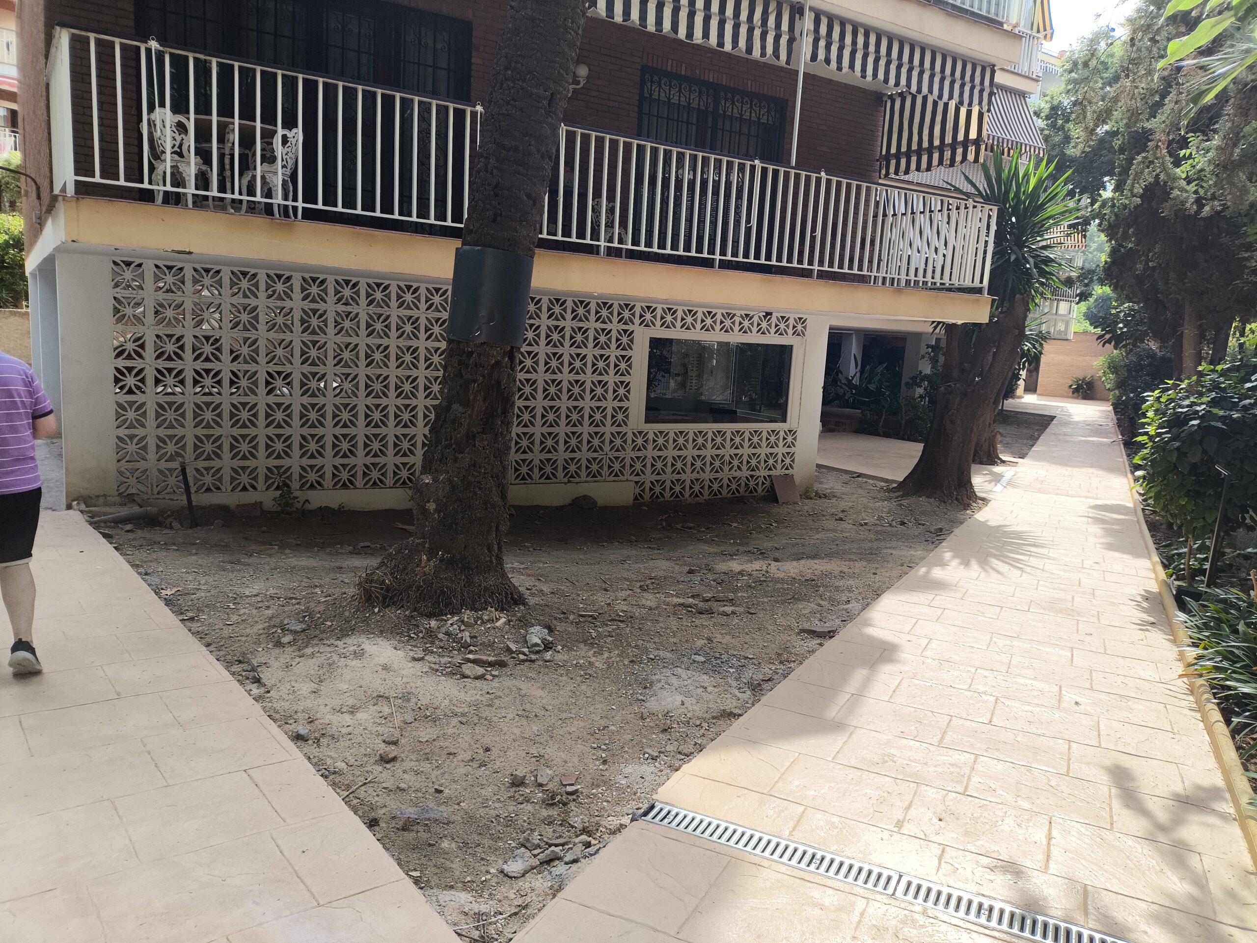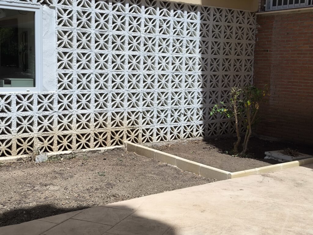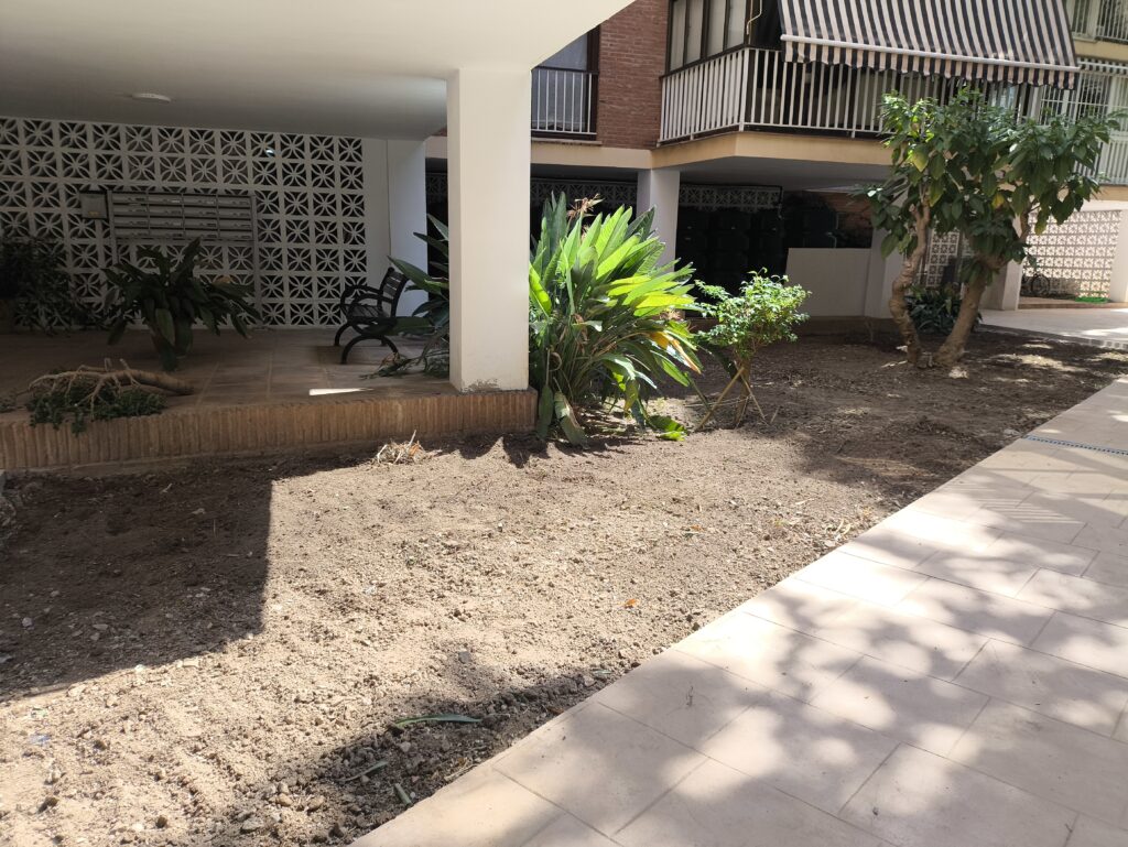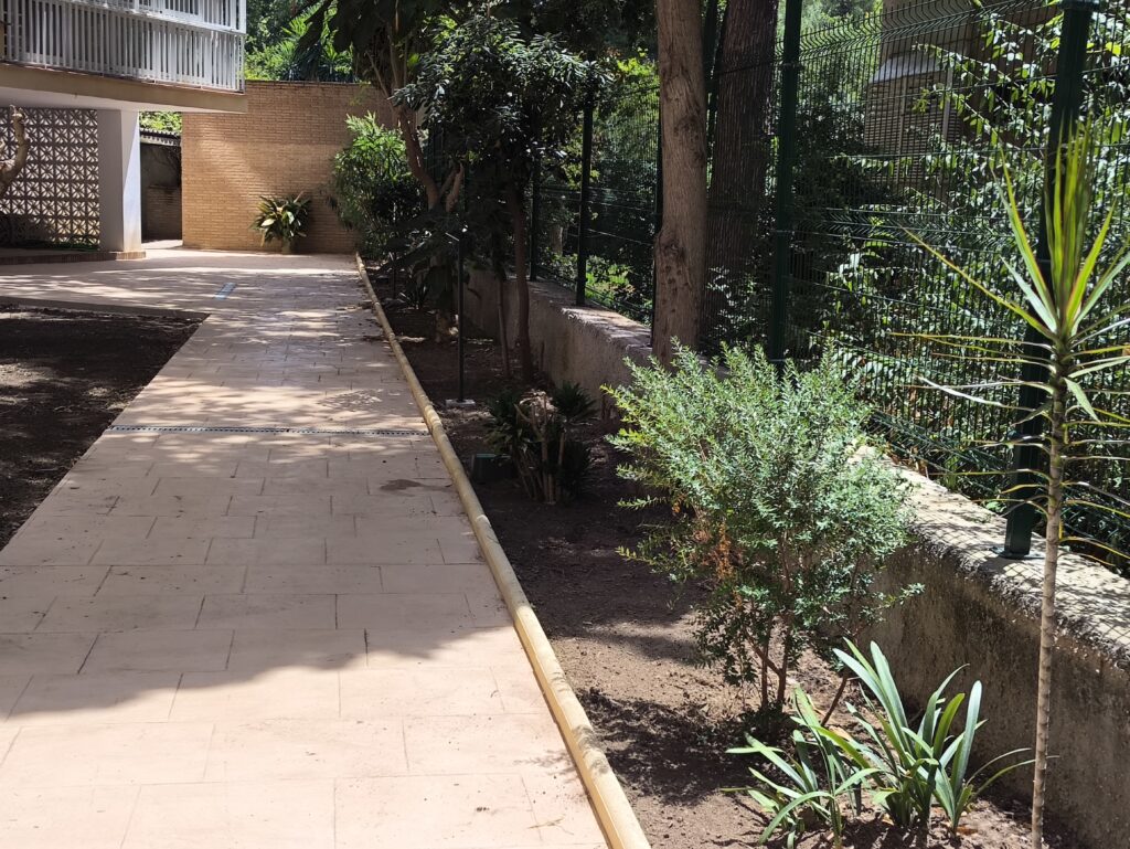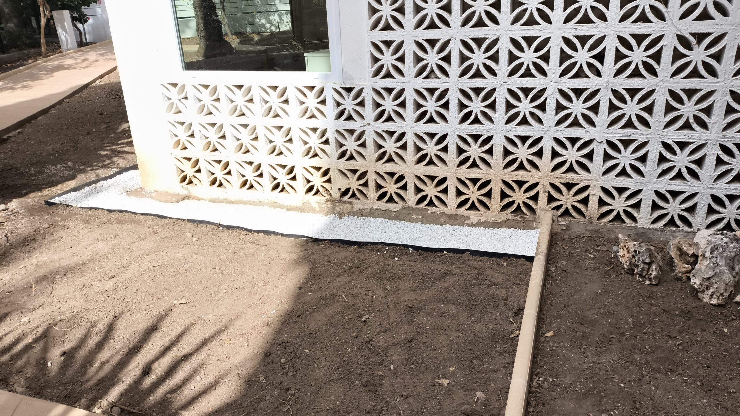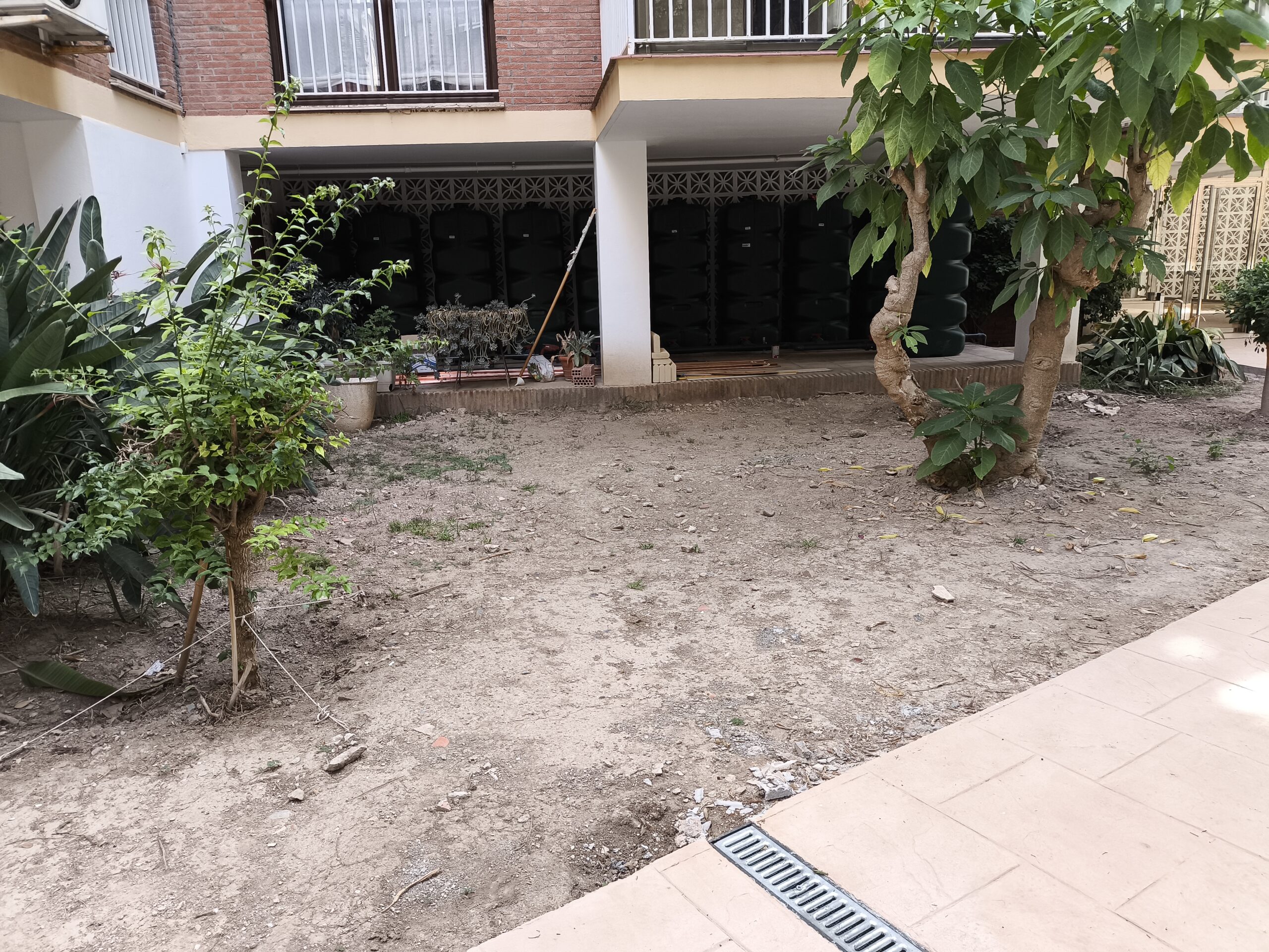 En esta urbanización del Limonar, unas obras en el recinto habían destrozado el jardín. Los propietarios vieron la oportunidad de mejorar su resiliencia, ya que las restricciones de riego del año anterior habían afectado severamente. Les propusimos crear tres zonas diferenciadas. En la cochera, sustituir el césped de grama por una cobertura de Lippia, con riego por difusores. En el arriate que linda con la propiedad vecina, un riego por goteo, manteniendo la estructura básica de lo que quedaba del jardín y rellenando con suculentas para aumentar la cobertura de suelo. En el resto del jardín, un diseño de jardín ecológico sin riego, adaptado a las condiciones de muy baja insolación del terreno.