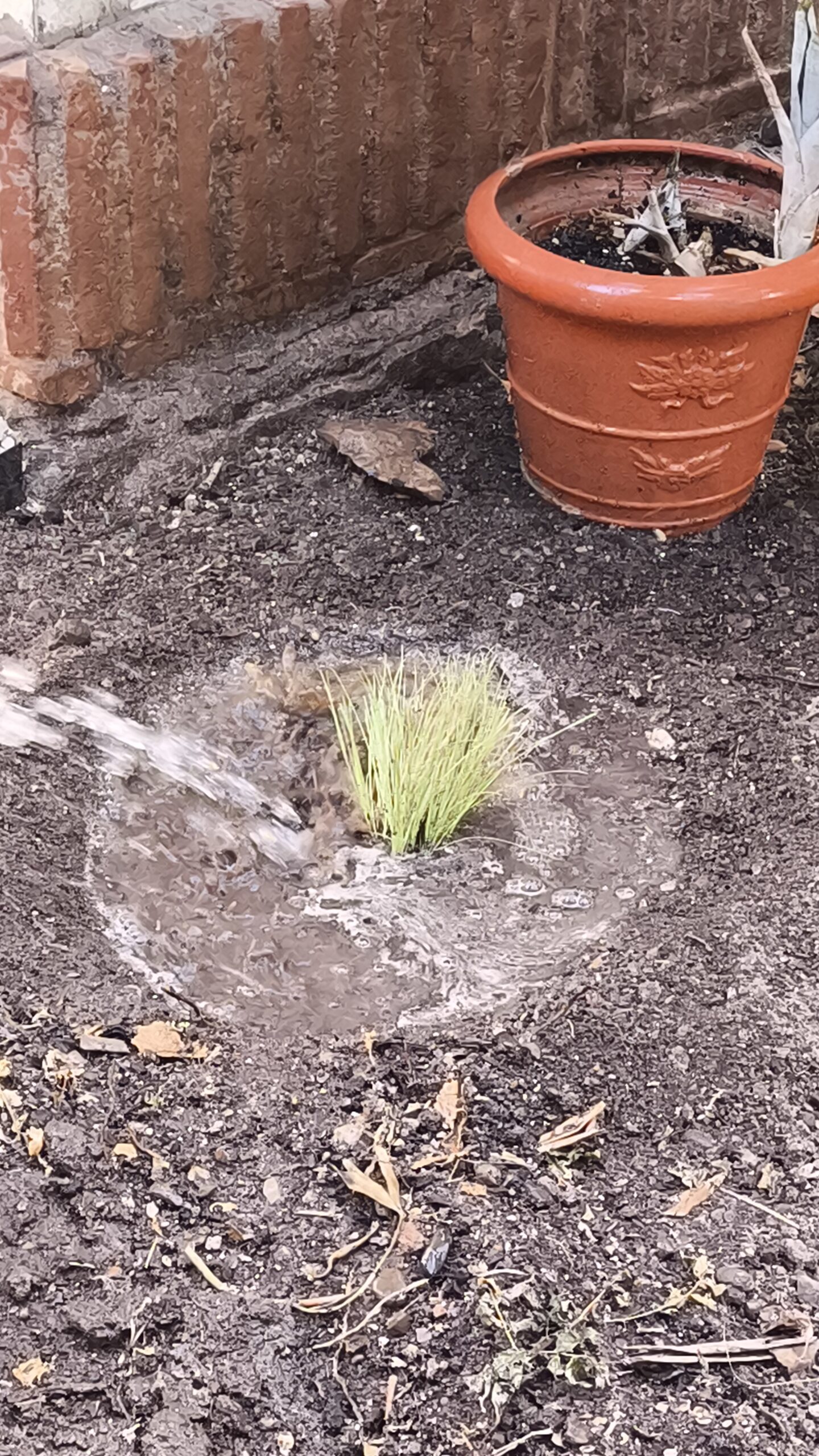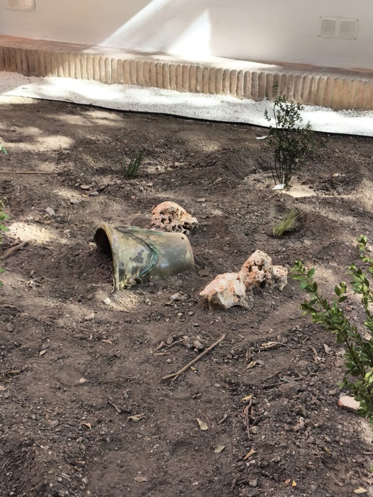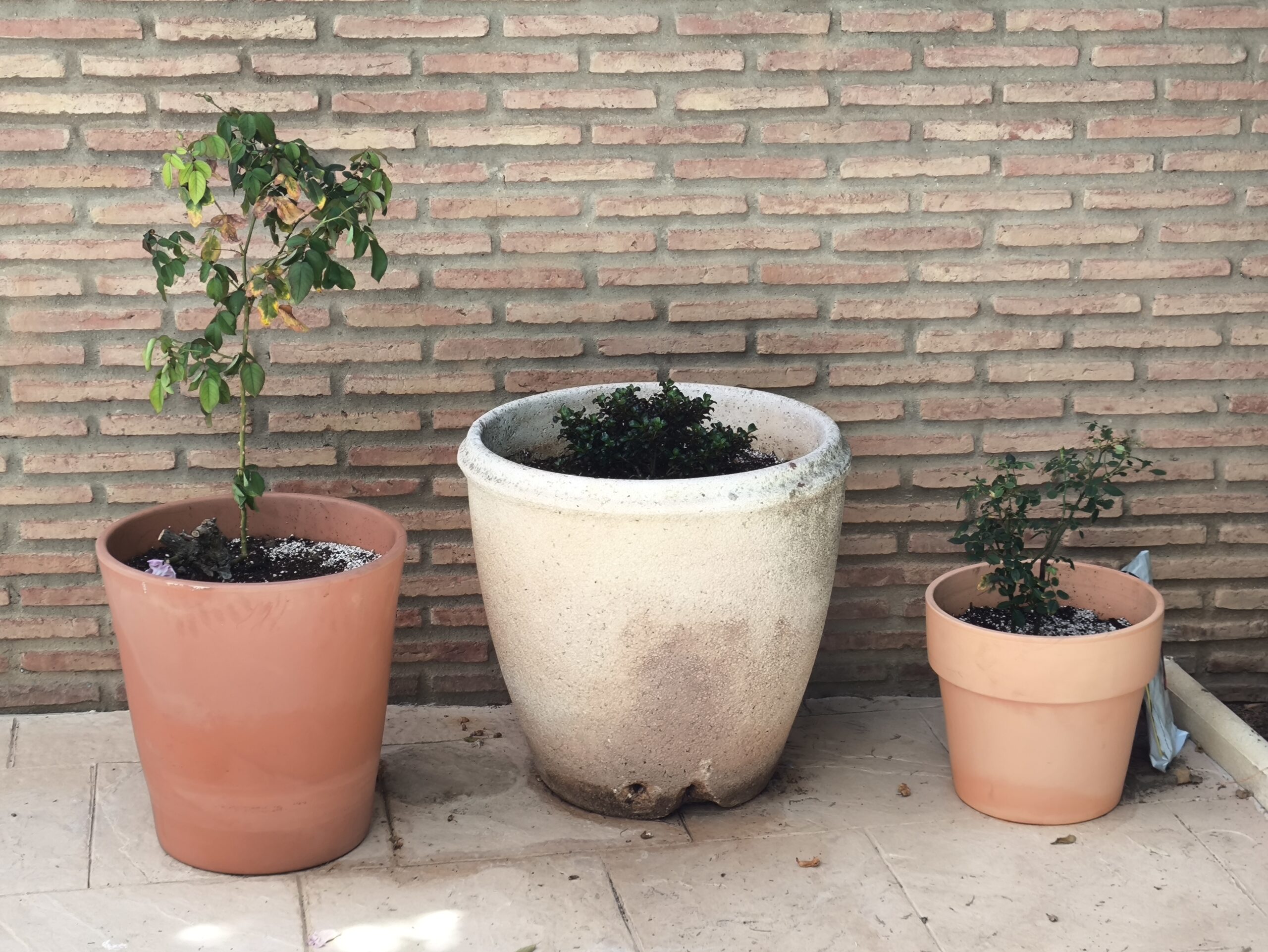 Aunque no formaban parte del diseño ecosistémico, teníamos dos rosales que hacía falta quitar de las jardineras, y decidimos darles una oportunidad: En el punto focal del camino había un macetón roto con unas aspidistras. El macetón lo empleamos para dar un toque decorativo al jardín del fondo. En su lugar pusimos tres macetones de diferentes tamaños con los dos rosales y un Coprosma ‘chocolate’, más interesantes.