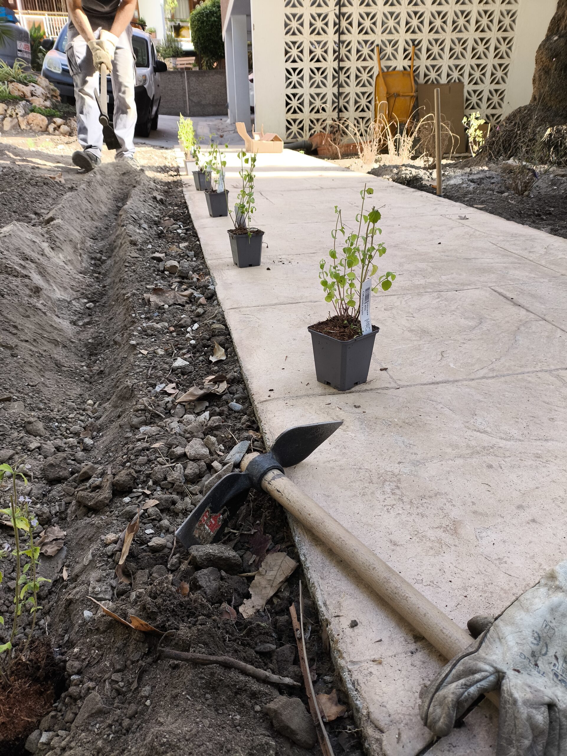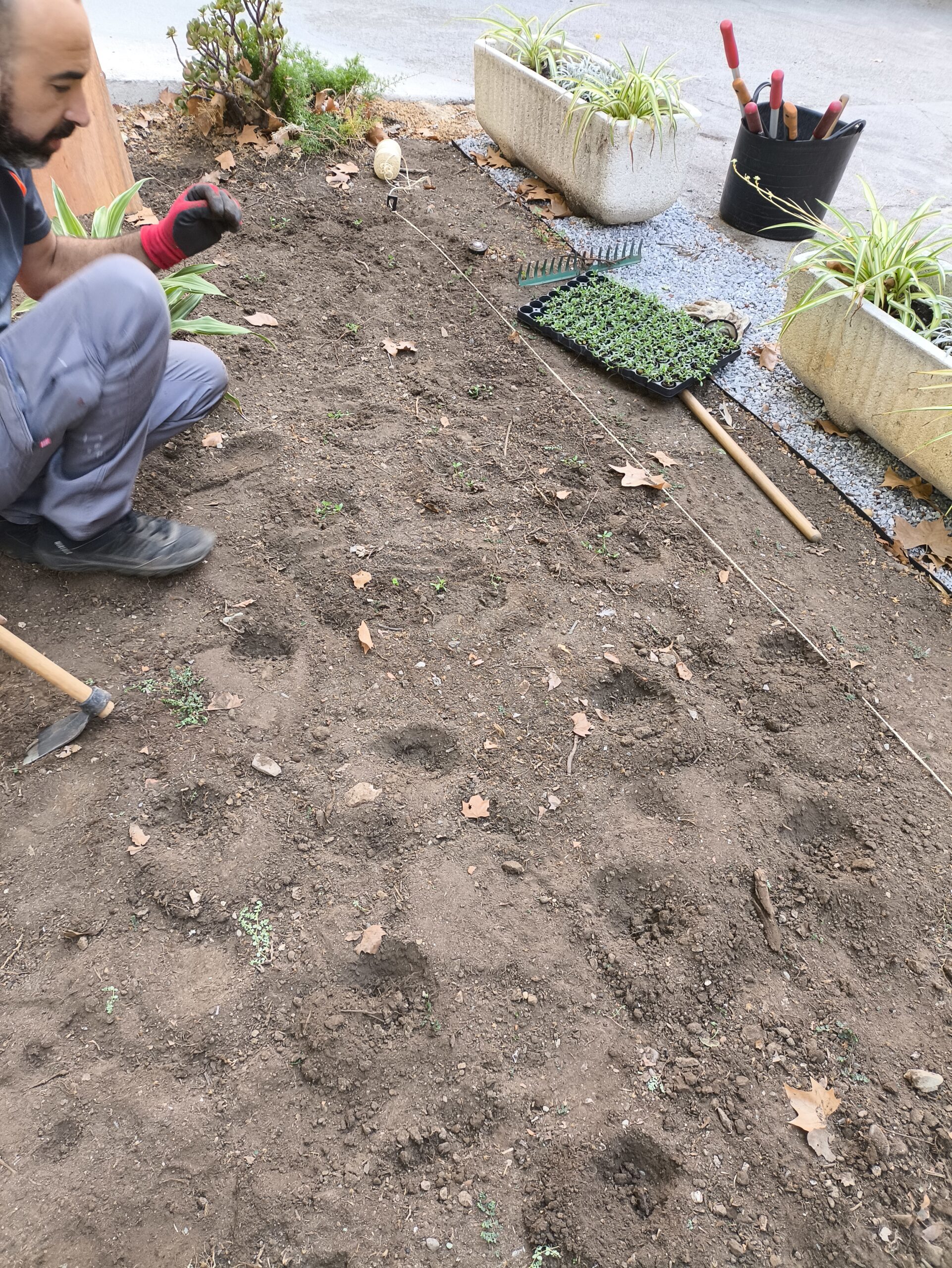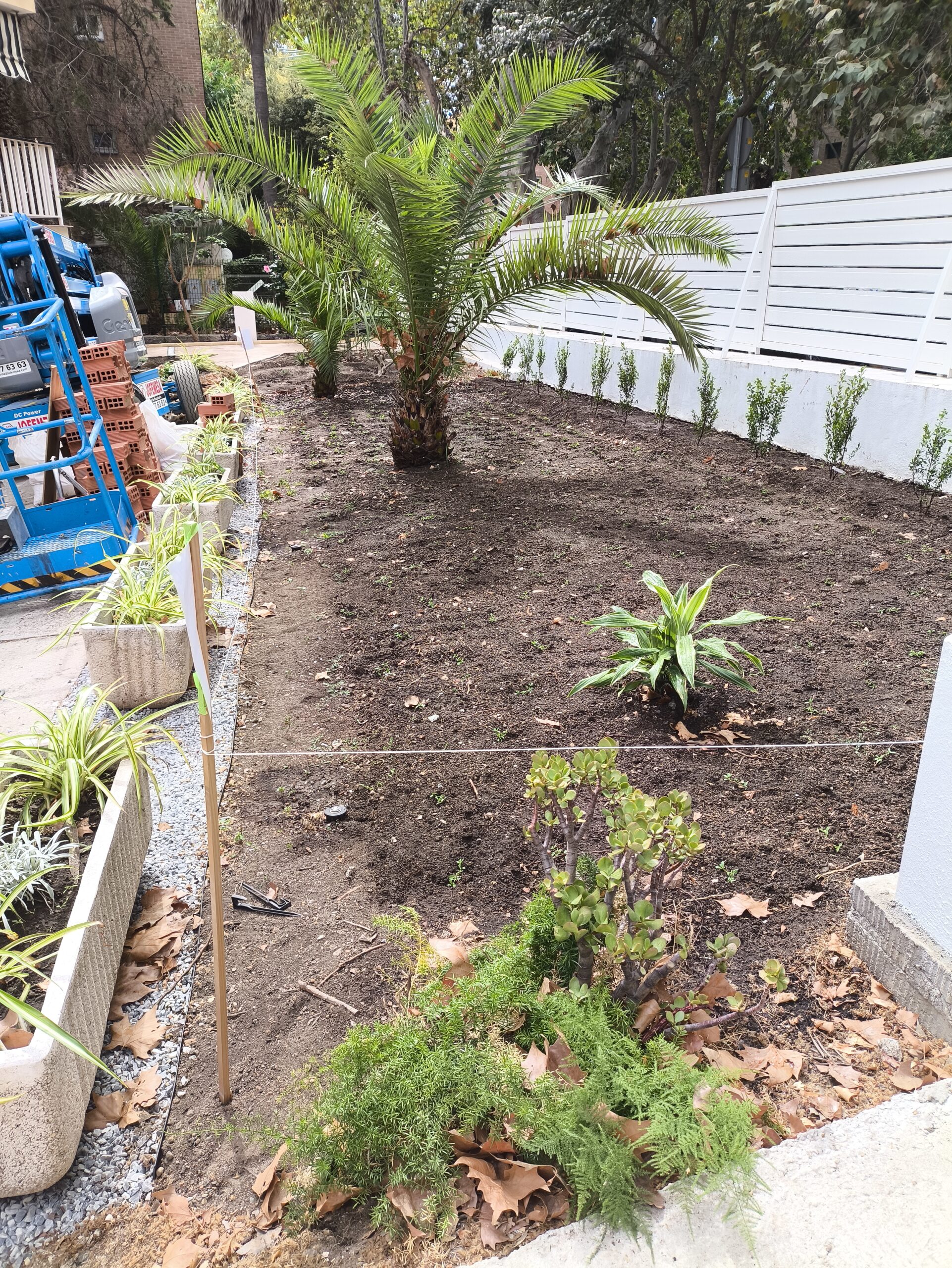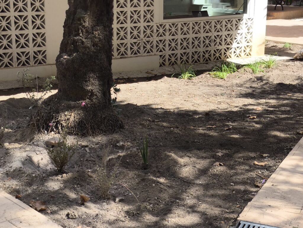 Para Septiembre habían llegado casi todas las plantas, y para Octubre ya estaba todo plantado. Se utilizó el sistema de Filippi (huecos de riego generosos, plantas pequeñas, riegos muy espaciados e intensos). Además, incluimos cartelería para indicar que el jardín se va mantener con métodos ecológicos (acolchado con hojas trituradas, cero tóxicos, respeto a la fauna).