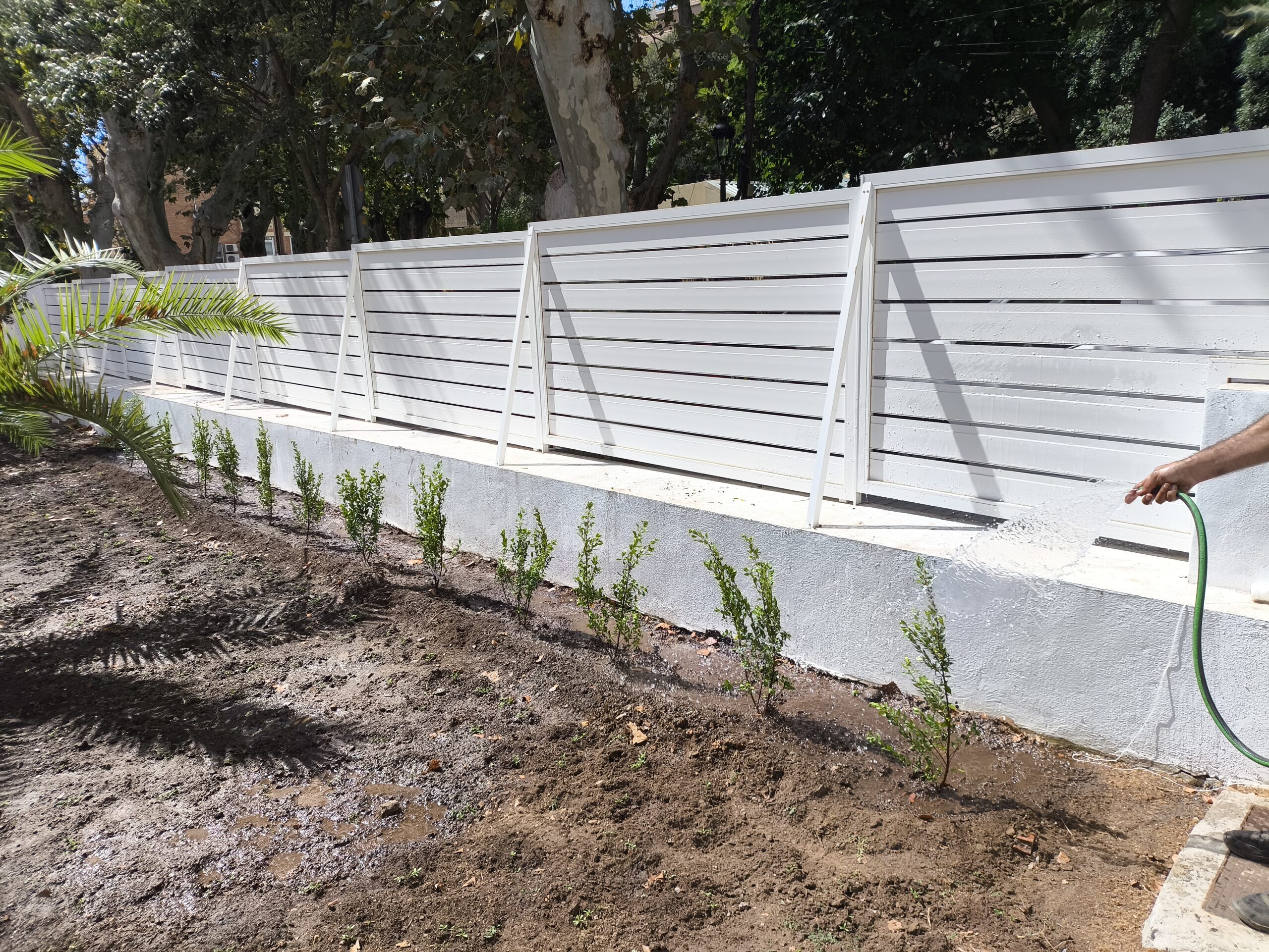 En la entrada de las cocheras, además de la lippia, añadimos un seto alto de Myrtus communis, y modificamos las jardineras para uniformar su aspecto, con cintas y gazanias.