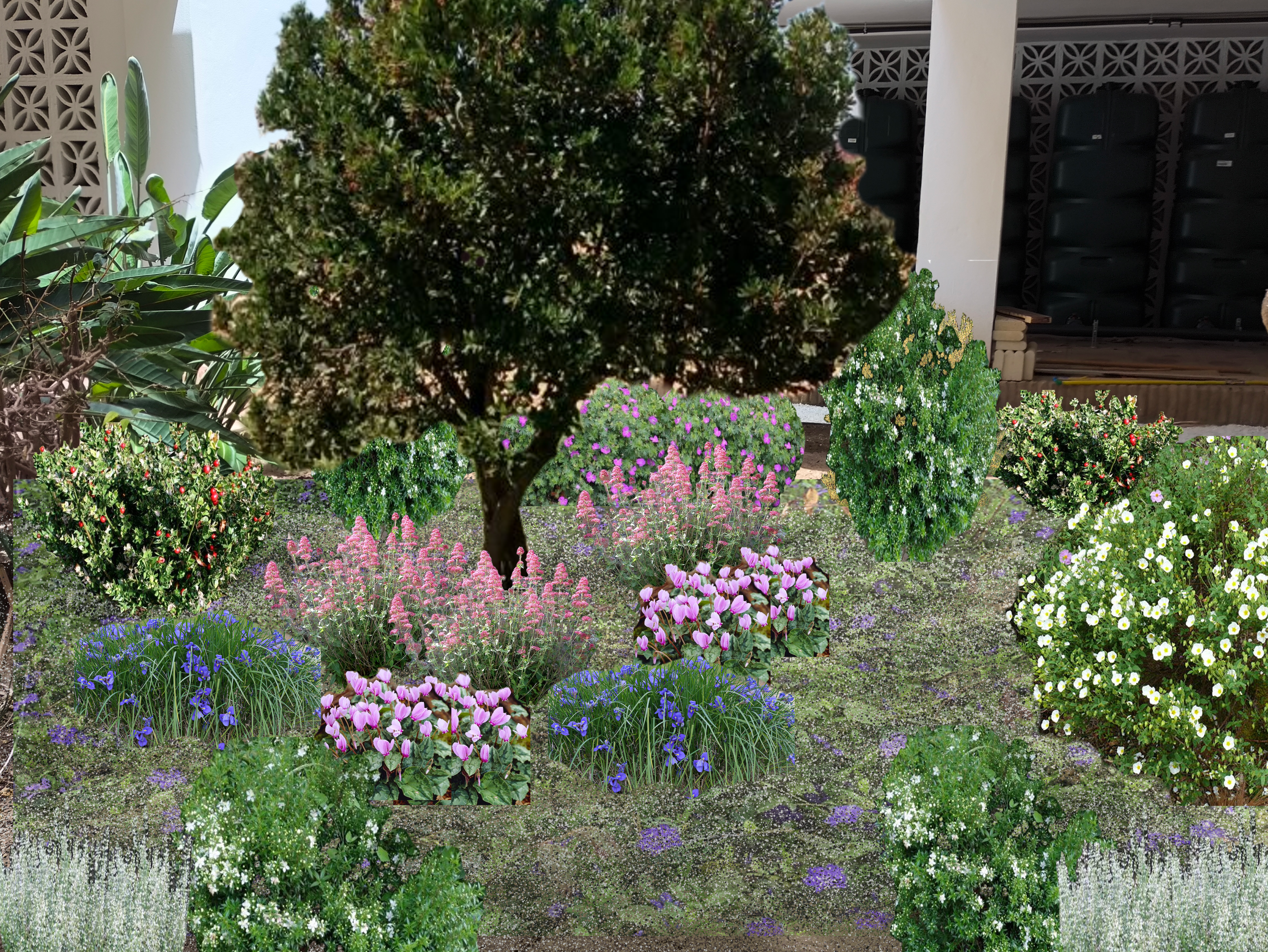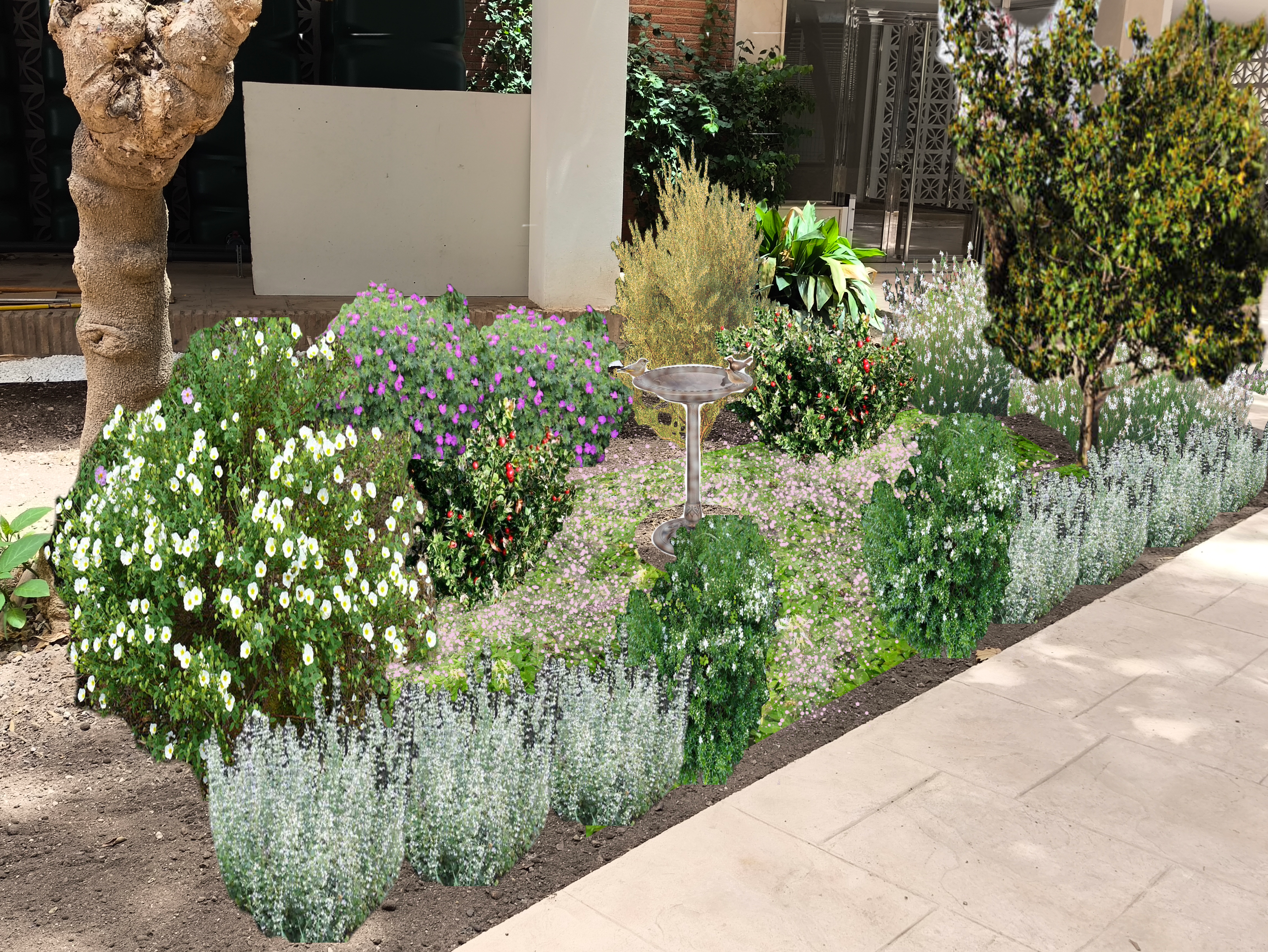 Para la estructura principal escogimos Rhamnus alaternus y Arbutus unedo, con soporte de Elaeagnus umbellata. En segundo nivel propusimos Ruscus aculeatus, Geranium sanguineum, Cistus salviifolius, Melica ciliata y Miscanthus sinensis. Y a nivel bajo, Carex comans y flores variadas como Hemerocallis, Centranthus roseus, Cyclamen hederifolium, Iris unguicularis y Limonium, además de un mix de semillas de pradera. Se rodea el conjunto con un seto bajo de Calamintha nepeta, Gaura rosea y pórticos de Myrtus communis.