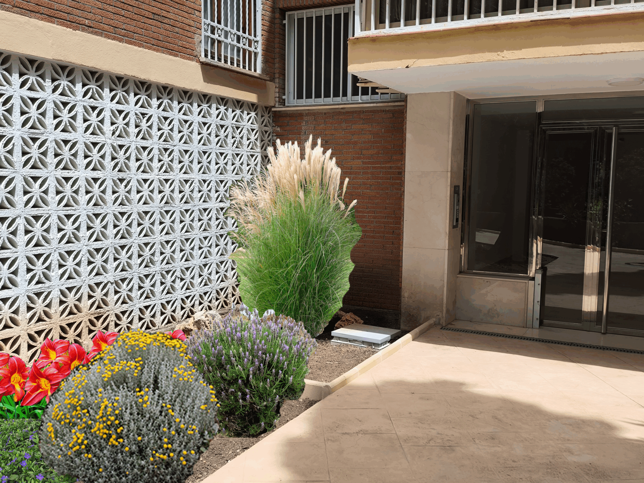 En el arriate, buscamos recuperar el ritmo de la estructura con hibiscos cada dos metros, seguidos de dracaenas, y terminando con Viburnum tinus. Los huecos se rellenan con Crassula ovata, Sansevieria y Tradescantia pallida. A la salida del portal, se añadió un detalle con cactus y aeoniums, y otro con Zamioculcas.